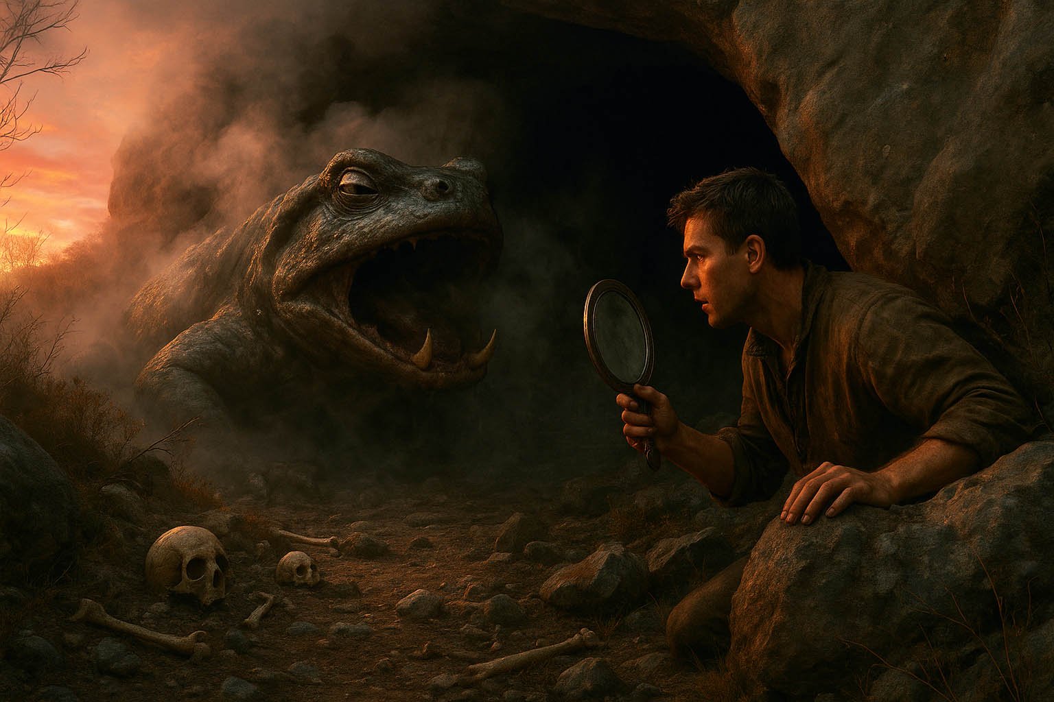 Čia jaunikaitis nugirdo keistą garsą, panašų į verdančio vandens kunkuliavimą. Sustojo ir žvilgterėjo iš už didžiulio akmens, ir tai, ką pastebėjo, buvo taip baisu, kad drąsuolis vos nesuriko iš baimės ir veidrodžio iš rankų vos neišmetė. Juodoje urvo angoje gulėjo baisybė, rupūžės galva, plačiais nasrais, iš kurių kyšojo didelės, riestos iltys. Jis buvo tamsiai žalias, panašus į didelį driežą. Užpakalinė siaubūno kūno dalis nyko urvo tamsumoj, o po ištiestomis pirmutinėmis letenomis gulėjo baisiausiai sukruvintas ir apdraskytas jaunos merginos kūnas. Tiktai galva buvo neliesta, o veide ir plačiai atvertose akyse paliko priešmirtinio išgąsčio žymės.