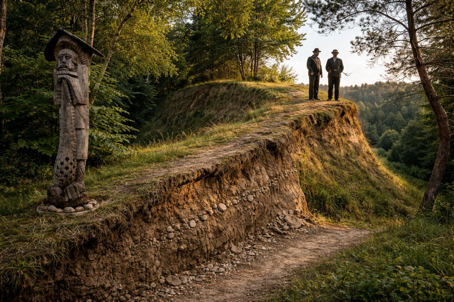 Įdomus tame skardyje, bet jau grynai gamtos padaras geologinis konglomeratas, išsikišęs į kelią iš dešinojo skardžio šlaito. Geologinj konglomera labai retai galima sutikti Lietuvoje ir mūsų gamtininkai privalėtų atkreipti reikalingos domės. Matytas konglomeras sudarytas iš mažų akmenėlių ir smėlio, bet taip tvirtai sulipytas, kad norėdami paimti jo dalį turėjome padėti daug vargo.